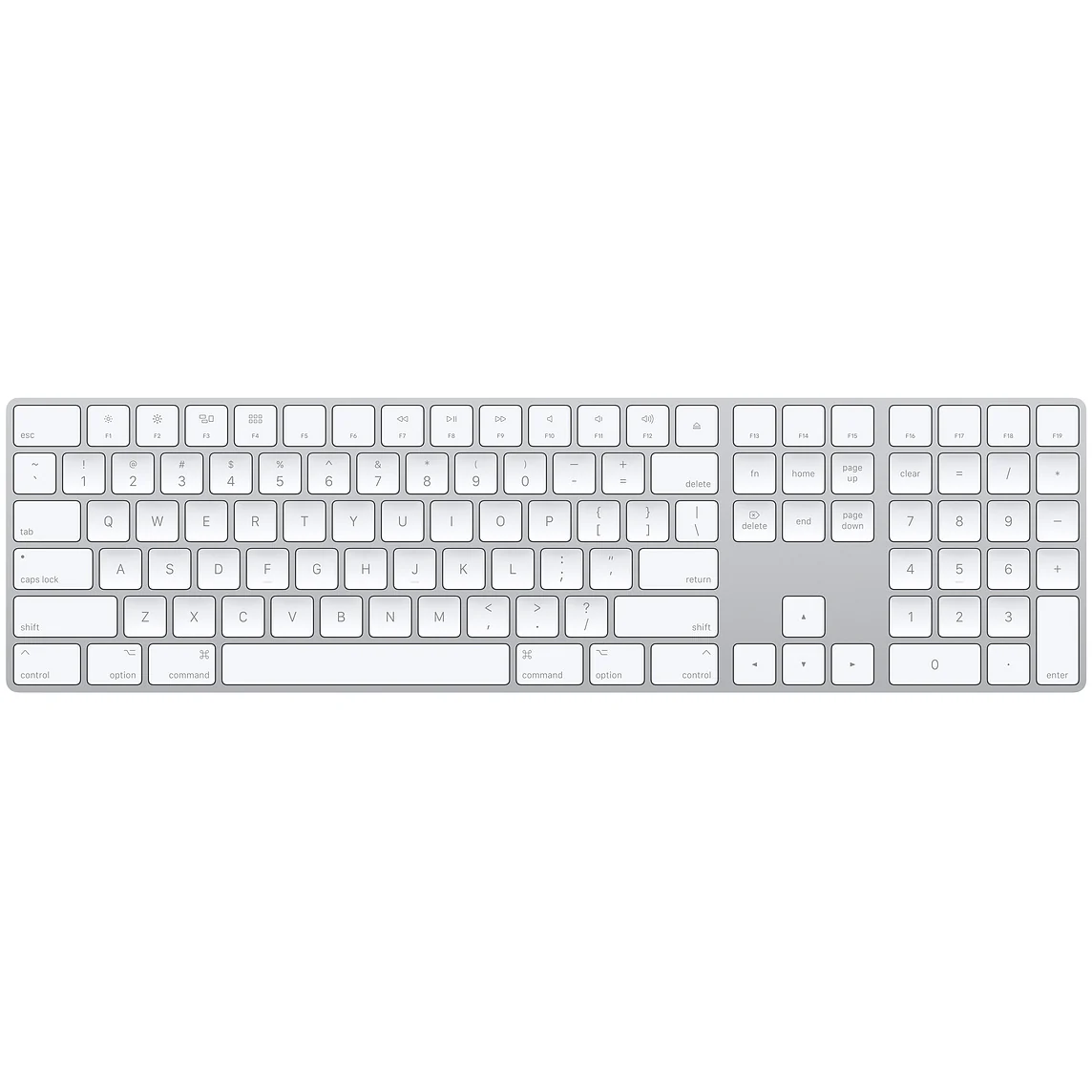 Magic Keyboard with Numeric Keypad features an extended layout, with document navigation controls for quick scrolling and full-size arrow keys for gaming.